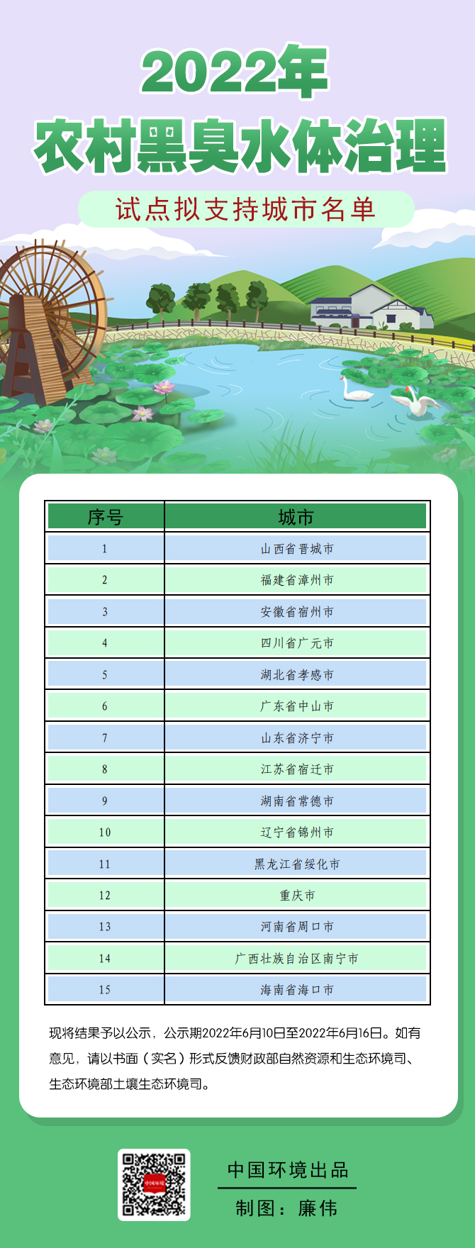 根據(jù)競(jìng)爭(zhēng)性評(píng)審結(jié)果,財(cái)政部、生態(tài)環(huán)境部擬將15個(gè)城市確定為2022年支持的農(nóng)村黑臭水體治理試點(diǎn)城市,2022年6月10日至2022年6月16日為公示期。期間如有意見(jiàn),請(qǐng)以書(shū)面(實(shí)名)形式反饋財(cái)政部自然資源和生態(tài)環(huán)境司、生態(tài)環(huán)境部土壤生態(tài)環(huán)境司。