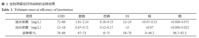 3. 不同雨水工程的污染物去除效果 3.1 生物滯留池 生物滯留池進(jìn)出水水質(zhì)與污染物去除率見表1。從表1可以看出,生物滯留池進(jìn)水水質(zhì)相當(dāng)于GB 3838—2002《地表水環(huán)境質(zhì)量標(biāo)準(zhǔn)》劣Ⅴ類,特別是COD較高,為72~86 mg/L,進(jìn)水水質(zhì)差主要是由工程匯水范圍內(nèi)車流量較大引起的。