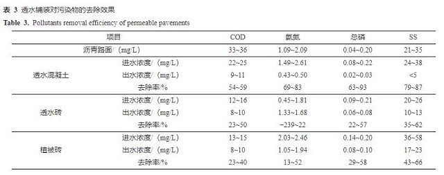 本研究中透水鋪裝建成2年,使用年限較短,對污染物的去除效果明顯。有研究證明,隨著使用年限的增長,透水鋪裝去除污染物的效果會逐步下降[25],但是通過清洗,可使透水鋪裝材料中污染物(特別是COD和氨氮)溶出,使其對污染物的去除效果有所恢復(fù)。因此,透水鋪裝工程應(yīng)及時清洗維護(hù),以保持其污染物去除效能[26]。
