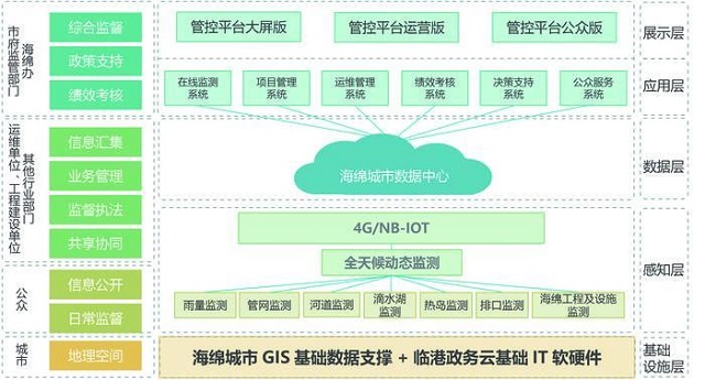 臨港海綿城市智慧管控平臺(tái),集硬件監(jiān)測設(shè)備和軟件系統(tǒng)為一身,包括集成站、岸邊站、管網(wǎng)流量計(jì)、雨量計(jì)、在線監(jiān)測系統(tǒng)、項(xiàng)目管理系統(tǒng)、運(yùn)維管理系統(tǒng)、績效考核系統(tǒng)、決策支持系統(tǒng)、公眾服務(wù)系統(tǒng)等。管控平臺(tái)在系統(tǒng)建設(shè)過程中融合“水彈性城市”理念,主要使用物聯(lián)網(wǎng)、大數(shù)據(jù)、云計(jì)算等新一代信息化技術(shù),以云計(jì)算虛擬化平臺(tái)為基礎(chǔ),以海綿城市數(shù)據(jù)中心為核心,結(jié)合GIS(地理信息系統(tǒng))+物聯(lián)感知網(wǎng)絡(luò)構(gòu)建海綿城市智慧管控平臺(tái),多角度全方位實(shí)時(shí)監(jiān)測海綿城市建設(shè)過程及運(yùn)行情況,通過多源數(shù)據(jù)融合技術(shù)及數(shù)據(jù)分析技術(shù),實(shí)現(xiàn)對海綿城市從規(guī)劃建設(shè)到運(yùn)行管理的閉環(huán)精準(zhǔn)管理,實(shí)現(xiàn)海綿城市各區(qū)域、各部門、各系統(tǒng)、各設(shè)施的高效聯(lián)動(dòng),讓海綿城市功能得到充分、長效的發(fā)揮。