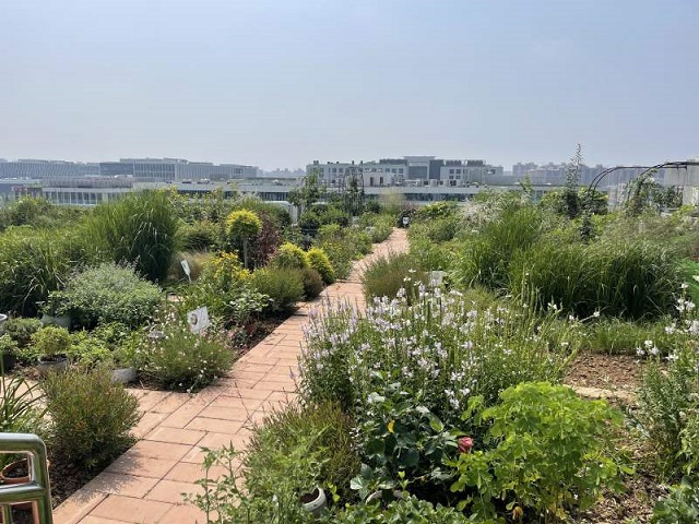 記者在園區看到,不僅花園、下凹式綠地能“吸水”,寫字樓的屋頂也是大“海綿”,不少企業在屋頂栽種了綠植,一家幼兒園還將屋頂改造成花園、菜園,孩子們多了親近大自然的空間,下雨天綠色的屋頂還能起到收納雨水的作用。