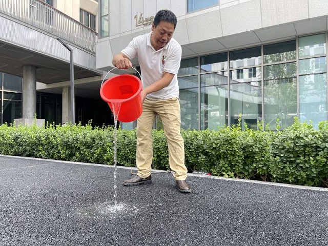 近年來,透水磚、滲水路面得到廣泛使用,在石景山保險產業園也同樣如此。園區暖通工程師那會義向記者展示了路面滲水試驗。那會義拎來一大桶水, 沖著路面倒了下去。記者看到,雖然水流流速很快,但路面就像干燥的海綿,可以把水快速吸干,一點兒積水都沒有。