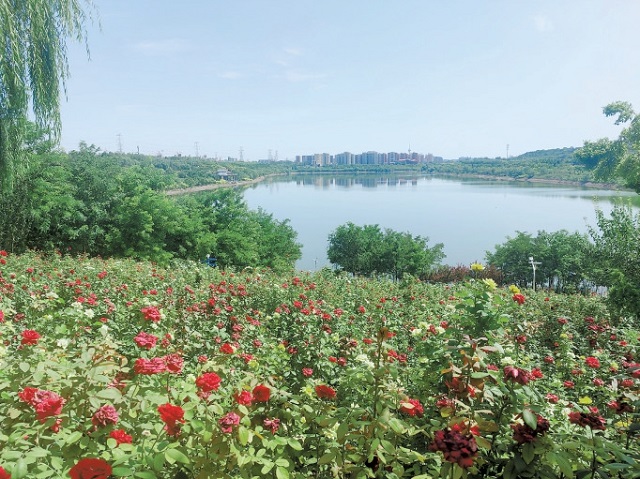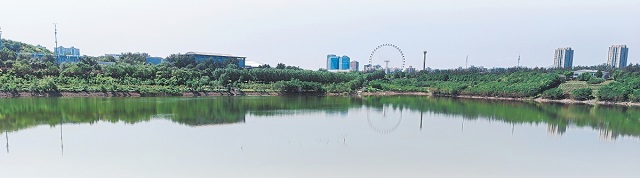 西郊雨洪調(diào)蓄工程阜石路砂石坑水面開闊,四周植被繁茂。
