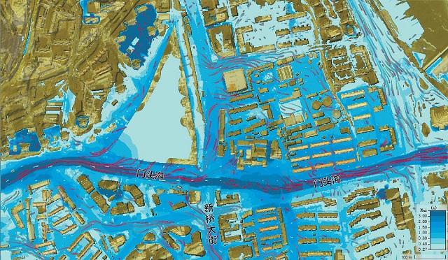 以受災(zāi)較嚴(yán)重的門頭溝和中門寺溝兩個流域?yàn)槔?月1日雨勢減小后,工作組即刻到山洪沖擊地區(qū)進(jìn)行現(xiàn)場調(diào)研,收集實(shí)地洪水排泄及淹沒資料;8月4日開始搭建洪水反演模擬模型,經(jīng)過近20次的驗(yàn)證調(diào)試,模擬結(jié)果基本符合實(shí)際。經(jīng)過驗(yàn)證的模型,可以模擬不同降雨條件下洪水和城市內(nèi)澇的淹沒情況,為災(zāi)后恢復(fù)重建、長遠(yuǎn)高質(zhì)量發(fā)展提供決策支持。