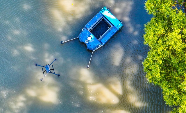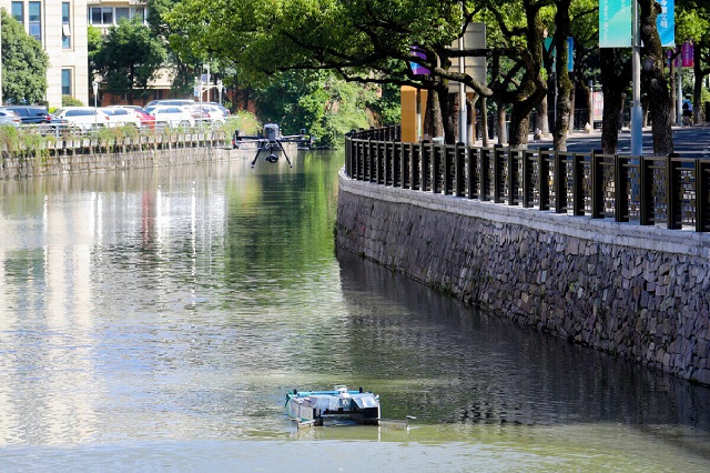 “分頭行動!”近日,在寧波海曙區西門口廣場,隨著指令發布,只見4架無人機整齊劃一的騰空而起,紛飛至任務執行方向,開始對北斗河、護城河、西塘河、賣魚河等4條重點河道進行巡查。通過無人機高分辨率攝像機航拍,如發現有河道漂浮物集中等現象,就能夠安排就近巡航的無人船或保潔人員前往指定地點清理。