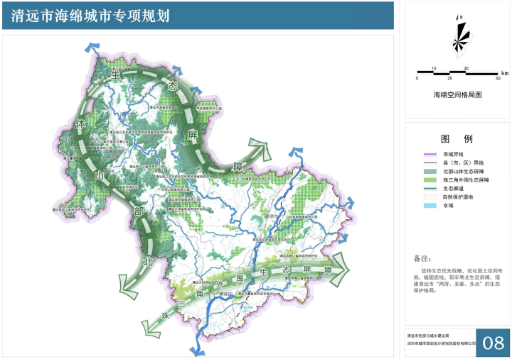 根據(jù)《規(guī)劃》,清遠(yuǎn)將構(gòu)建“兩屏、多廊、多點(diǎn)”的海綿生態(tài)空間格局。“兩屏”即北部環(huán)形生態(tài)屏障和珠三角外圍生態(tài)屏障。強(qiáng)化與周邊連綿山體的空間銜接和協(xié)同治理,推進(jìn)南嶺、筆架山、三桂山等山體屏障的生物多樣性保護(hù)、水土保持及水源涵養(yǎng),筑牢生態(tài)安全屏障,以限制城鎮(zhèn)建設(shè)無(wú)序擴(kuò)張。生態(tài)屏障內(nèi)限制開(kāi)發(fā)建設(shè)行為,針對(duì)連接屏障之間的耕地、城鎮(zhèn)等用地進(jìn)行嚴(yán)格管控,禁止破壞生態(tài)安全的活動(dòng),保障屏障的連續(xù)性和生態(tài)安全格局的完整性。