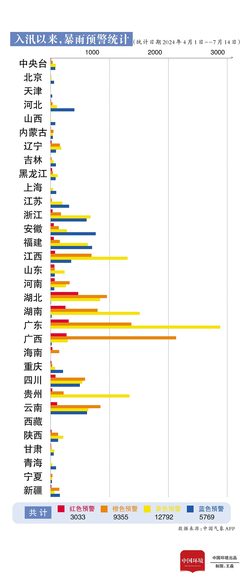 單月暴雨紅色預(yù)警同比增加61.1% 梳理發(fā)現(xiàn),4月1日入汛以來,全國發(fā)布?xì)庀箢A(yù)警信息16萬條,其中暴雨預(yù)警氣象災(zāi)害預(yù)警信息達(dá)到3萬余條,占比18.83%。據(jù)統(tǒng)計(jì),截止7月14日,中央氣象臺(tái)共計(jì)發(fā)布暴雨紅色預(yù)警9次。從全國情況來看,廣東發(fā)布暴雨預(yù)警信息4569條,湖北發(fā)布暴雨紅色預(yù)警信息多達(dá)470條。