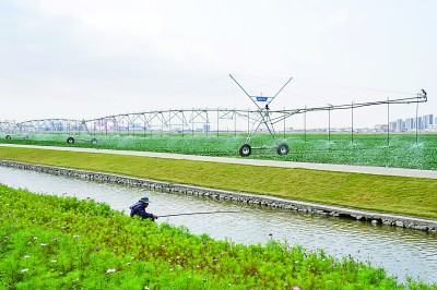 浙江舟山市岱山島,平移式噴灌機在由鹽田改造而成的農業產業園中作業。新華社發