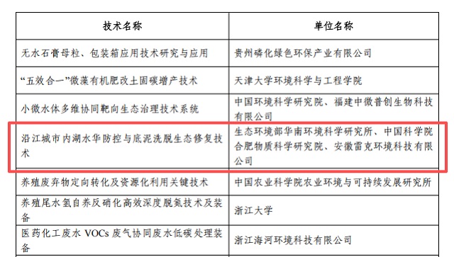 中國水工業裝備產業高質量供應鏈聯盟副理事長單位安徽雷克環境公司的“沿江城市內湖水華防控與底泥洗脫生態修復技術”入選長江生態環境保護修復技術清單